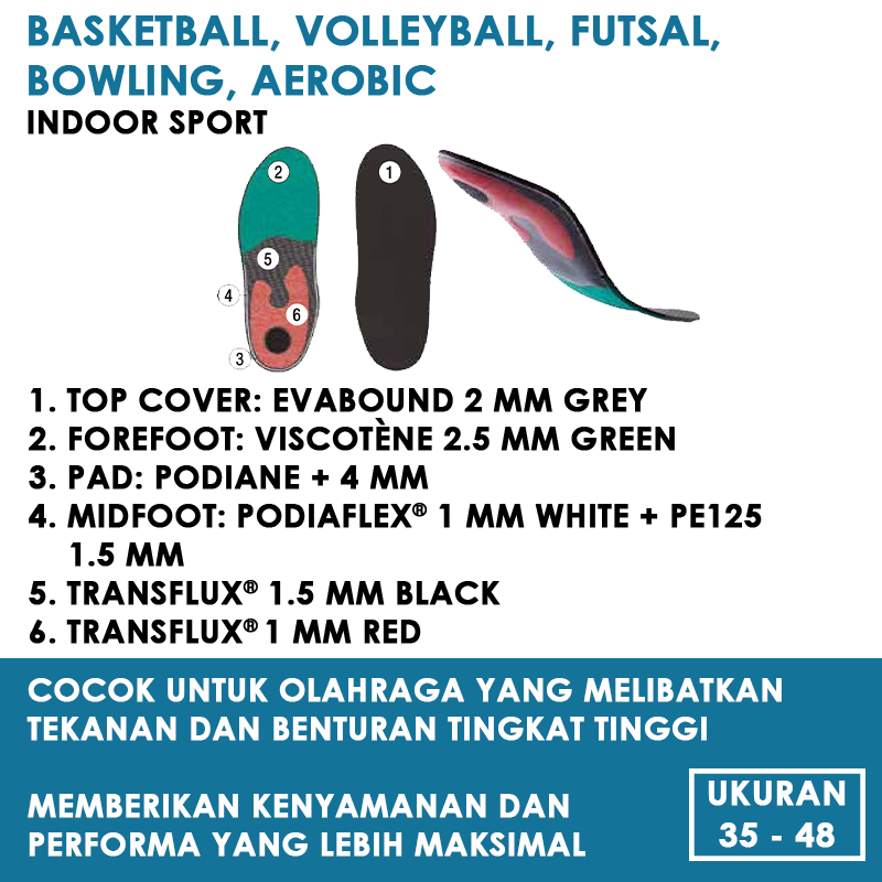 OPCT® Indoor dirancang untuk olahraga dalam ruangan dan khususnya untuk olahraga intens yang melibatkan benturan samping dan kebutuhan akan dukungan berat badan. Dilengkapi kombinasi berbagai bahan untuk memastikan kenyamanan dan performa.